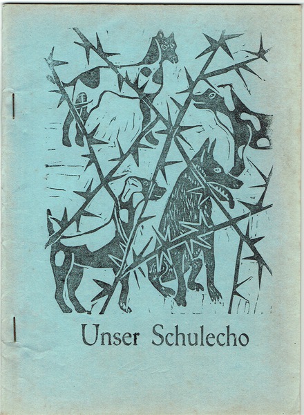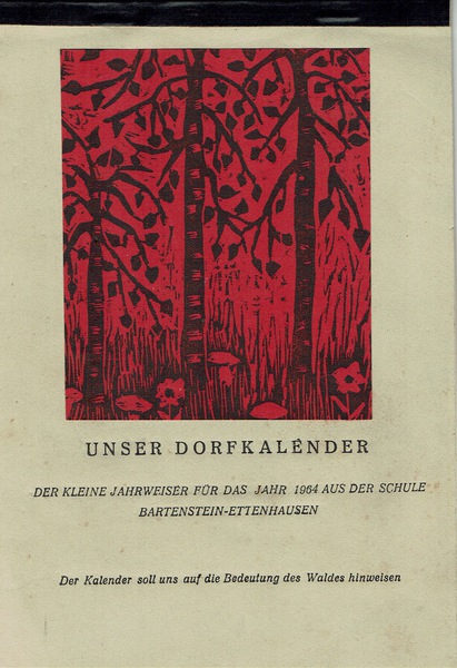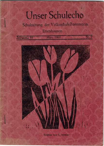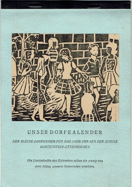 Bei der Jubliäumsfeier "50 Jahre Stadt Schrozberg" im Jahr 2023 präsentierte ich Druckwerke der Schuldruckerei. Der Lehrer Eberhard Langenbucher gründete und leitete die Schuldruckerei, in der die beiden ältesten Jahrgänge tätig waren. Für bemerkenswert halte ich die Linolschnitte, die Schülerinnen und Schüler für die Schulzeitschrift "Unser Schulecho" und für den Jahreskalender kreierten. Besonders die Arbeiten für den Jahreskalender geben ein Bild vom geschäftigen Leben in Bartenstein in den 1960er-Jahren.